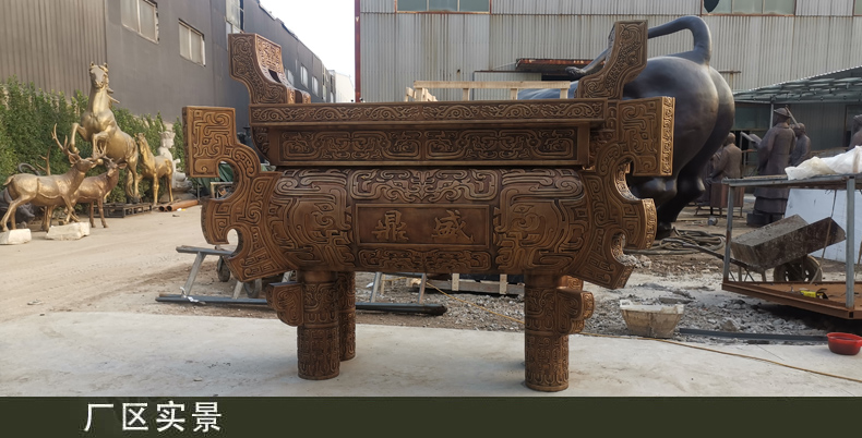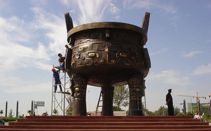 大型銅鼎雕塑是我國青銅文化時期的代表,鼎在古代被視為立國重器,是權力的象征。直到現(xiàn)在,人們?nèi)匀挥幸环N鼎崇拜的意識,“鼎”字也被賦予“顯赫”、“ 尊貴”、“盛大”等引申意義,如:一言九鼎、大名鼎鼎、鼎盛時期、鼎力相助,等等。鼎又是旌功記績的禮器,周代的國君或王公大臣在重大慶典或接受賞賜時都要鑄鼎,以旌表功績,記載盛況。